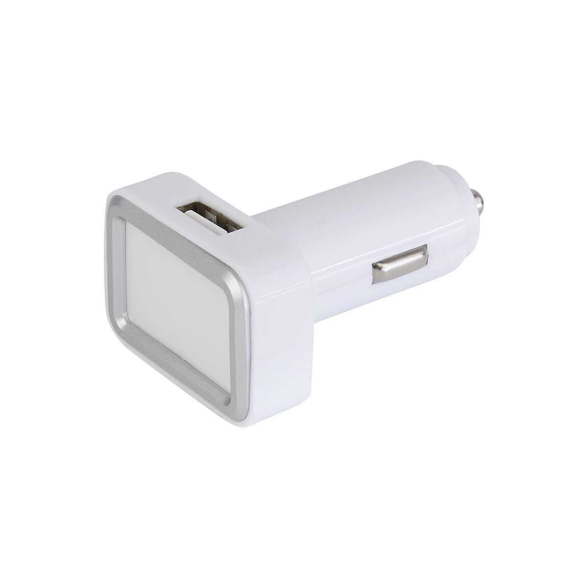 Cargador para automóvil con 2 entradas USB. El área de impresión enciende al conectar.