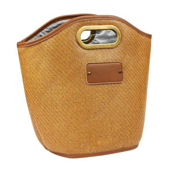 Hielera tipo bolsa con interior plastificado y sellado. Compartimento principal con diseño abierto. Asas con marco de metal. Capacidad para 12 latas. Material: Tejido de papel/ Algodón. Medida: 36 x 30.5 x 24 cm