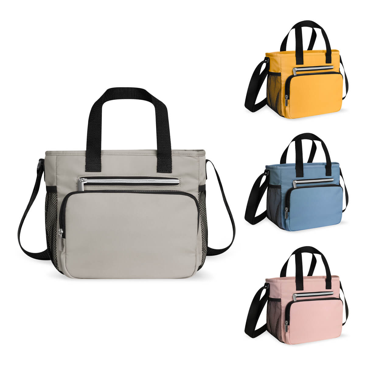 Hielera con interior plastificado impermeable. Bolsa principal con cierre, doble bolsillo frontal y dos bolsillos laterales de malla. Su práctico diseño le brinda comodidad y practicidad para almacenar alimentos y bebidas. Incluye correa para hombro ajustable. Capacidad de 10 latas. Medidas: 26.5 x 22.5 x 17 cm.