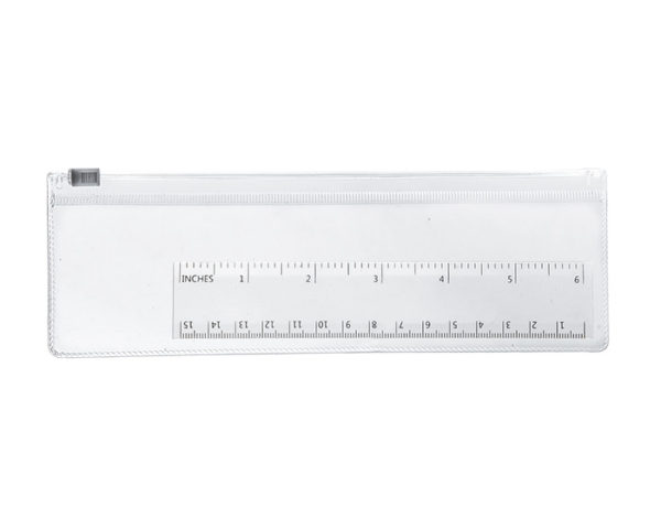 Portalapicera transparente de plástico con cierre de presión. Incluye una regla transparente de 15 cm.