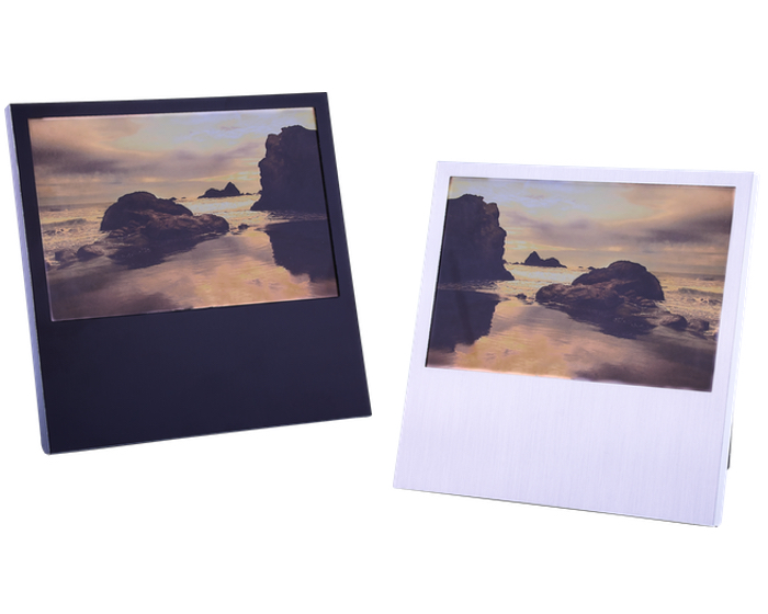 Portarretratos de aluminio de 16.2 x 16.2 cm con soporte plegable. Se puede acomodar de forma horizontal o vertical. Presentación: caja en color blanco.