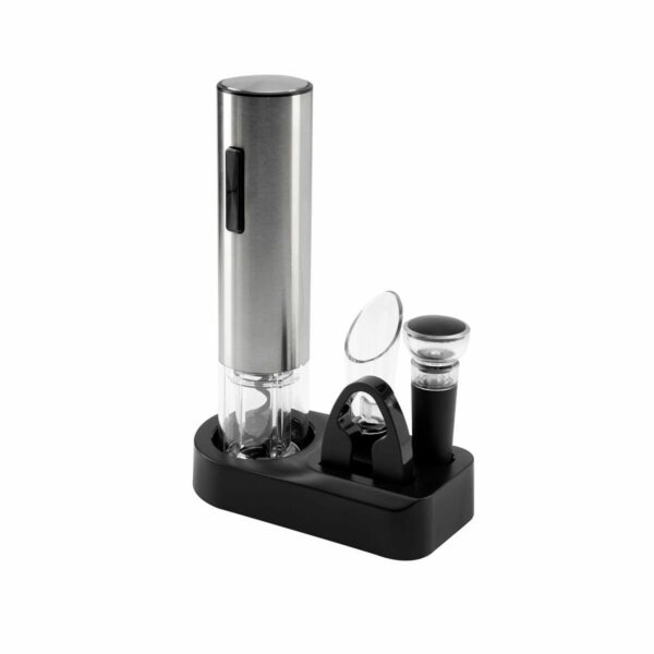 Set de sacacorchos eléctrico. Ideal para los amantes del vino. Contiene 1 sacacorchos con batería recargable y puerto tipo C, 1 cortador de papel aluminio, 1 vertedor para evitar salpicaduras, 1 tapón protector de vacío y 1 base para organizar los diferentes accesorios. Incluye cable auxiliar, manual de uso y caja individual.