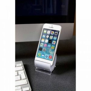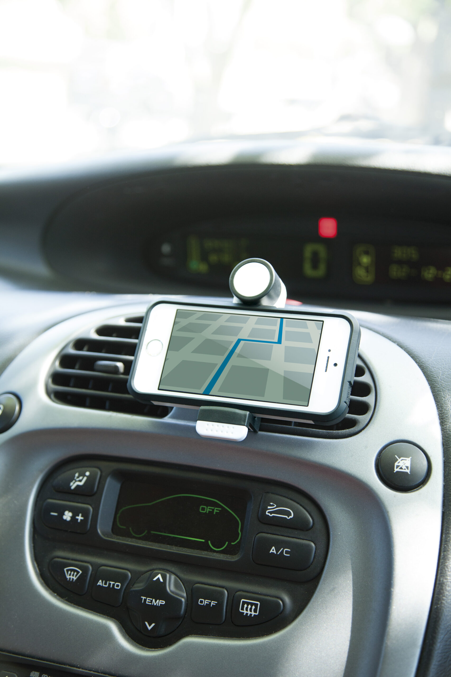 Soporte de celular para colocar en la rejilla del aire. En sus extremidades detalles engomados negros.