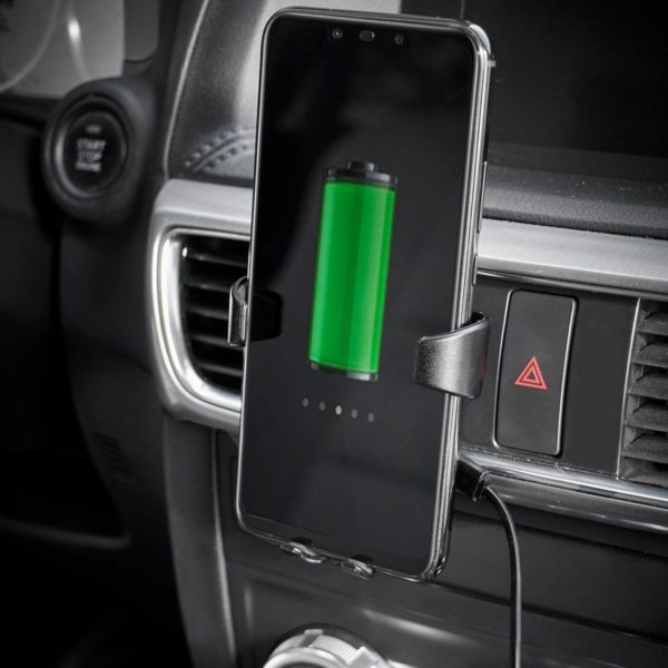 Soporte de smartphone para auto con función de carga inalámbrica. Incluye mecanismo ajustable de 7 a 10 cm de ancho. Se monta en las ventilas del aire acondicionado. Incluye cable cargador usb-micro usb.
