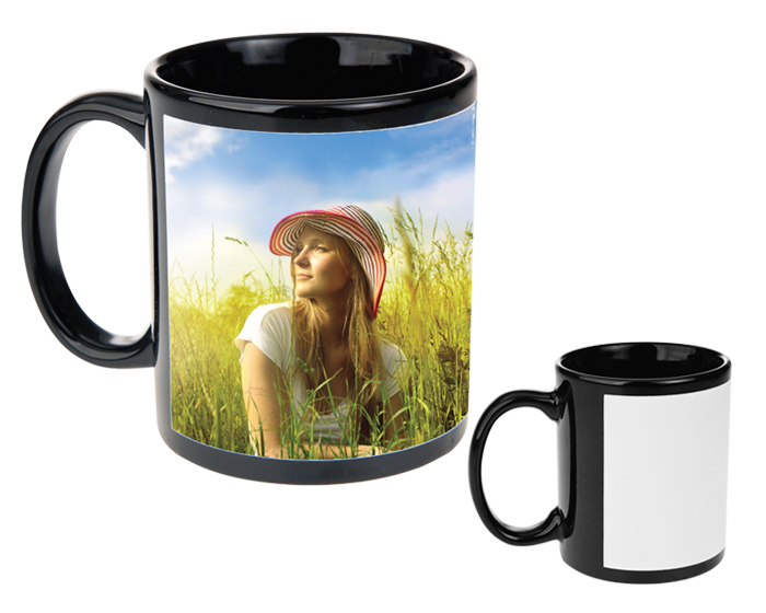 Tarro negro con cuadro blanco para sublimación . CAP. 11 OZ. Temperatura y Tiempo sugeridos para sublimar: 180 grados / 160 seg.